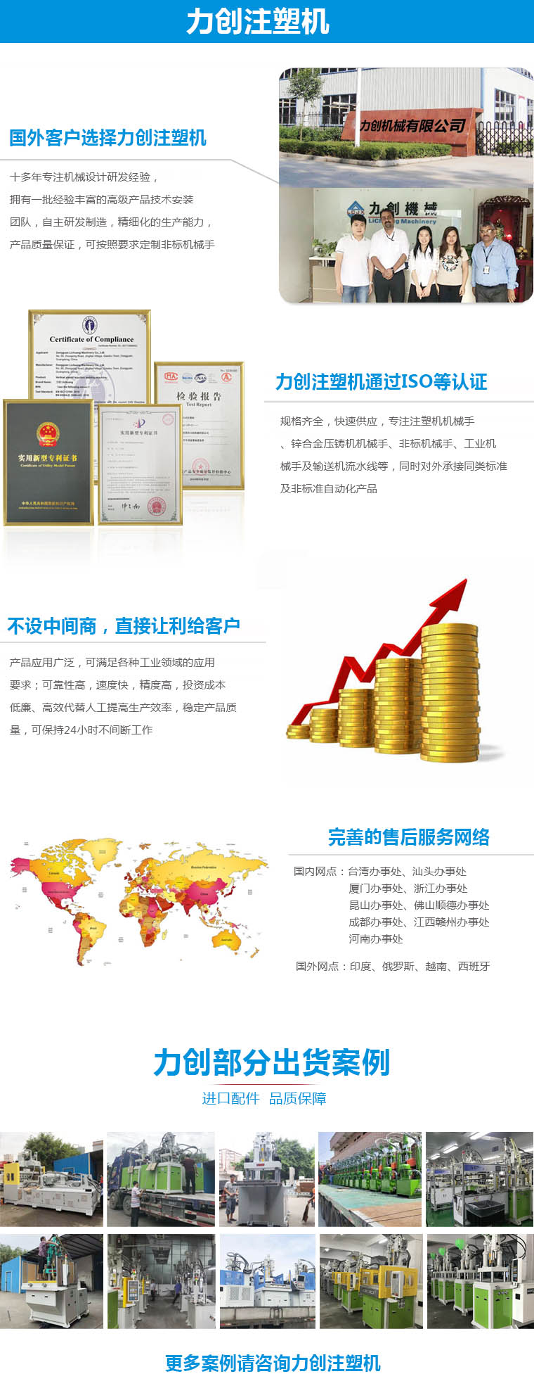 1.本機型為直壓式聯(lián)模結構,快速合模,慢速、低壓鎖模動作裝置,可確保模具安全,速度快,增加產(chǎn)量。